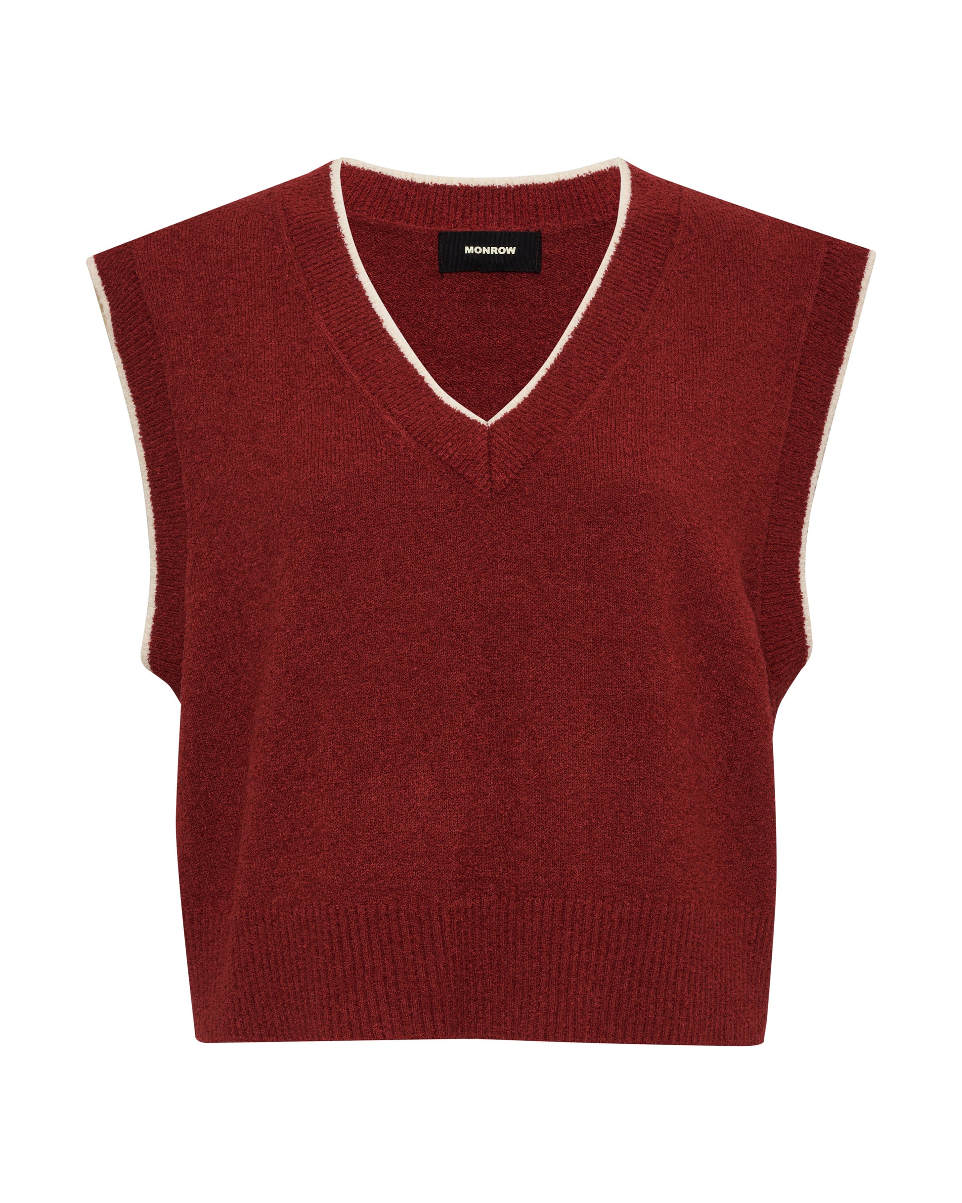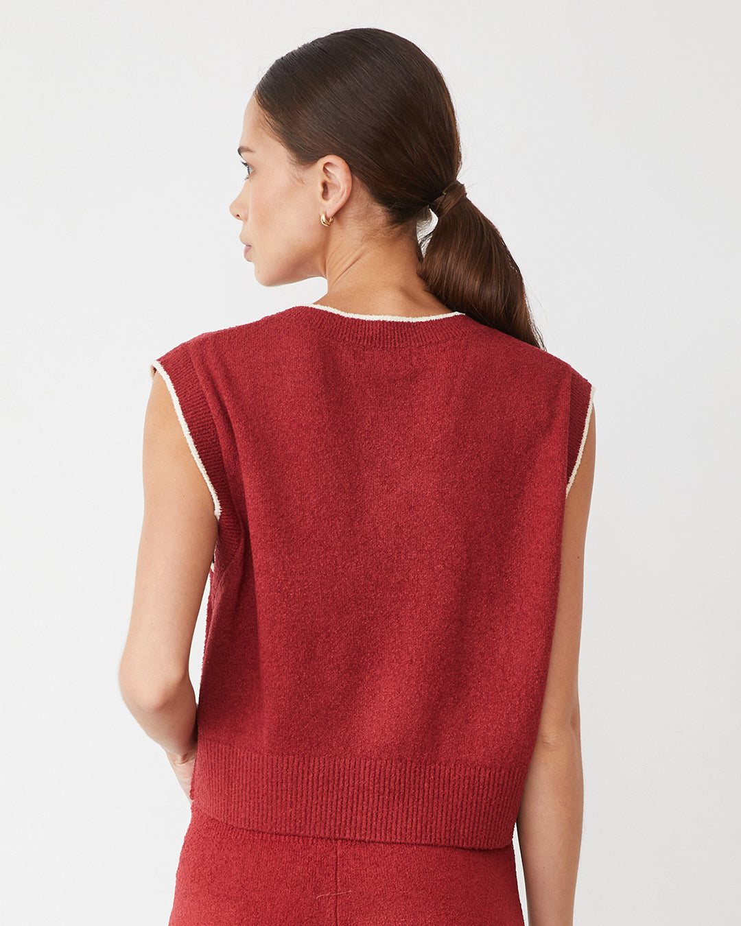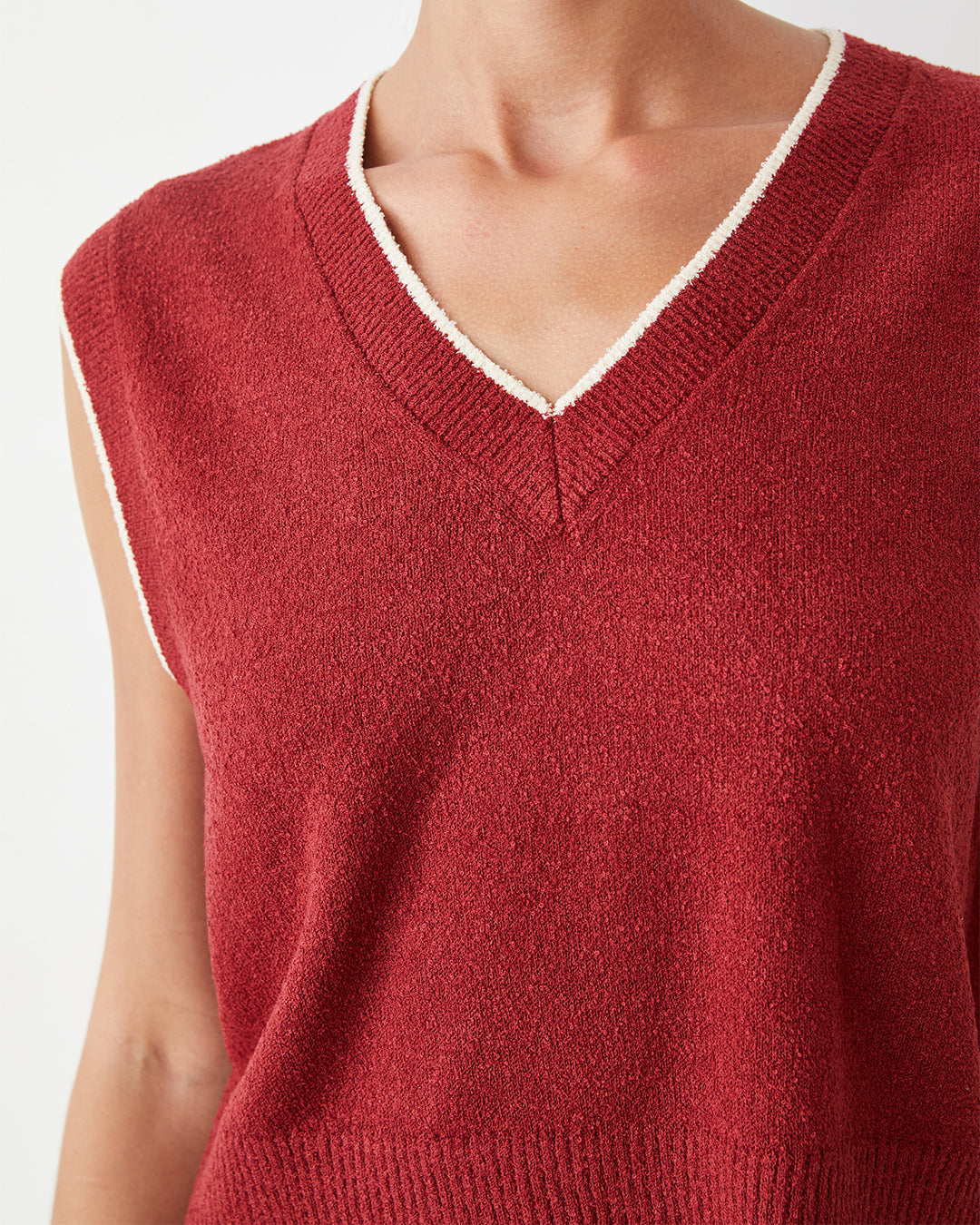 - Lightweight textured yarn and contrast tipping at the V-neck and armholes add modern, refined details