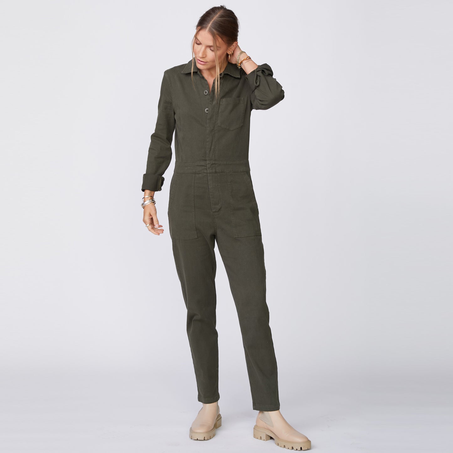 - Form meets function in our Fitted Jumpsuit. Made with our soft blend of linen and viscose fabric, this jumpsuit is made to last. Noteworthy details include a button up collar, tapered leg, and five pockets. Pair with your favorite winter boots and our Sherpa Utility Jacket to complete the look.