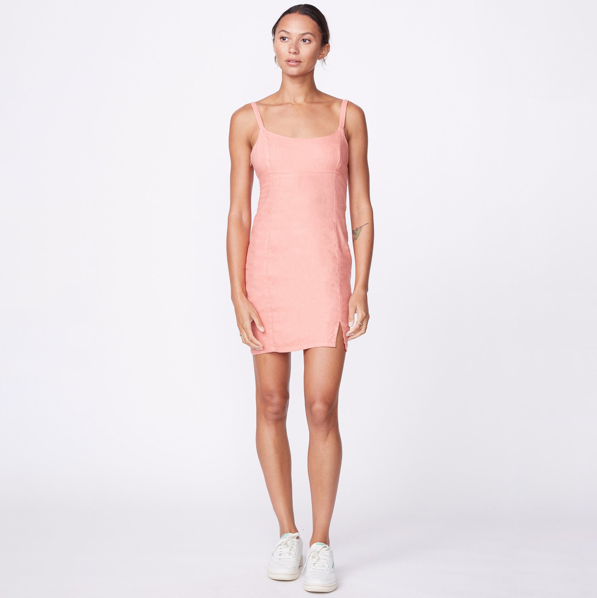 • You can never have too many dresses. Made out of our soft and light linen fabric, this ultra cute cami dress is fitted throughout with a smocked back for added comfort, seamed details and a modest side slit. The perfect grab and go look for those hot summer days ahead.