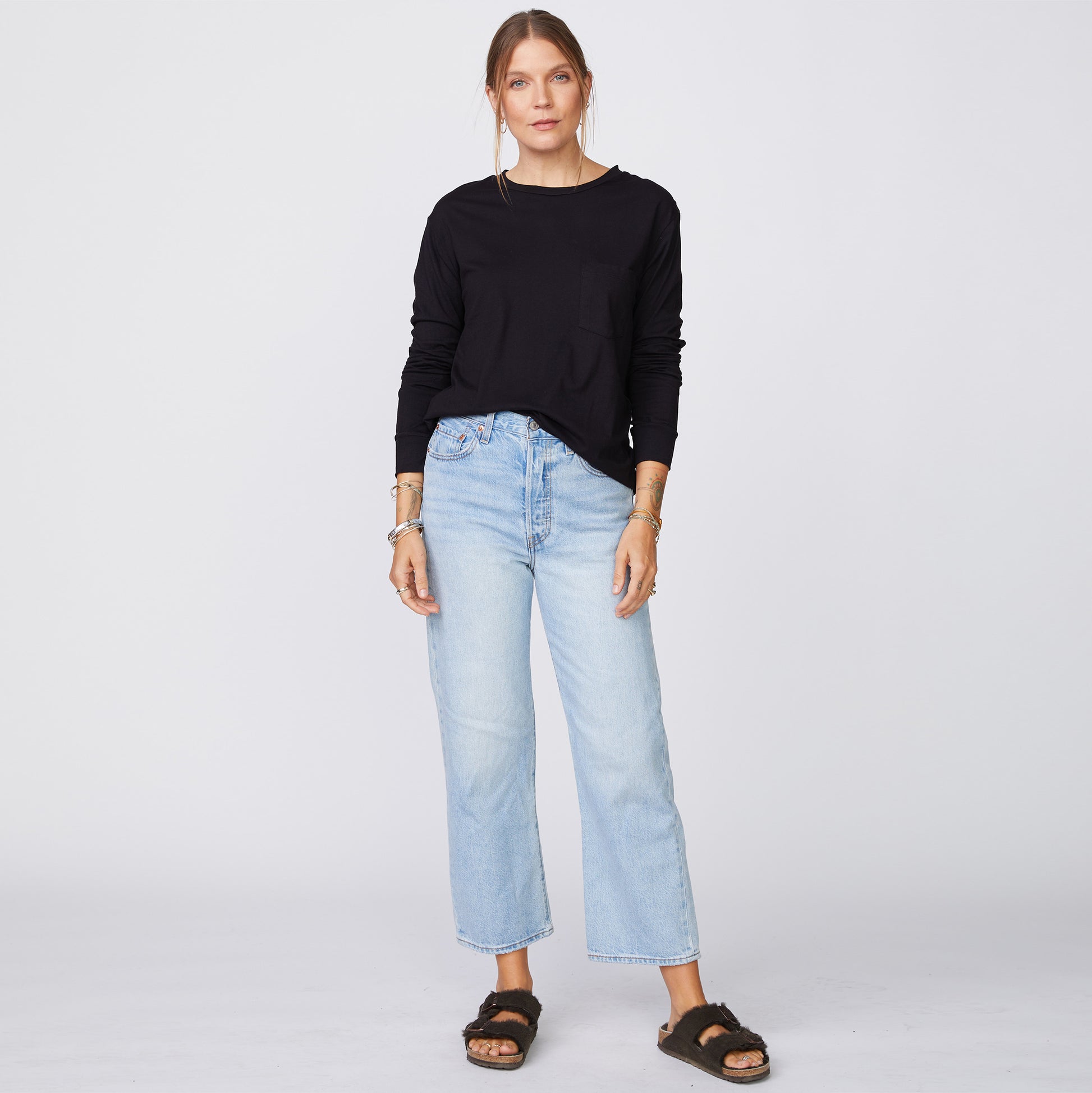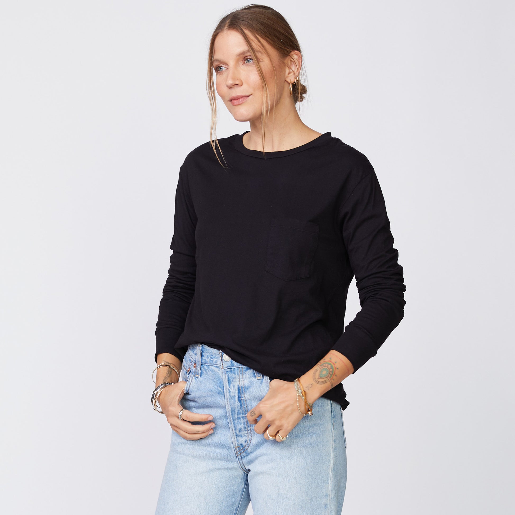 - Made from 100% cotton, this long sleeve relaxed pocket crew neck is ultra-soft and has that laid-back (but never lazy) fit.