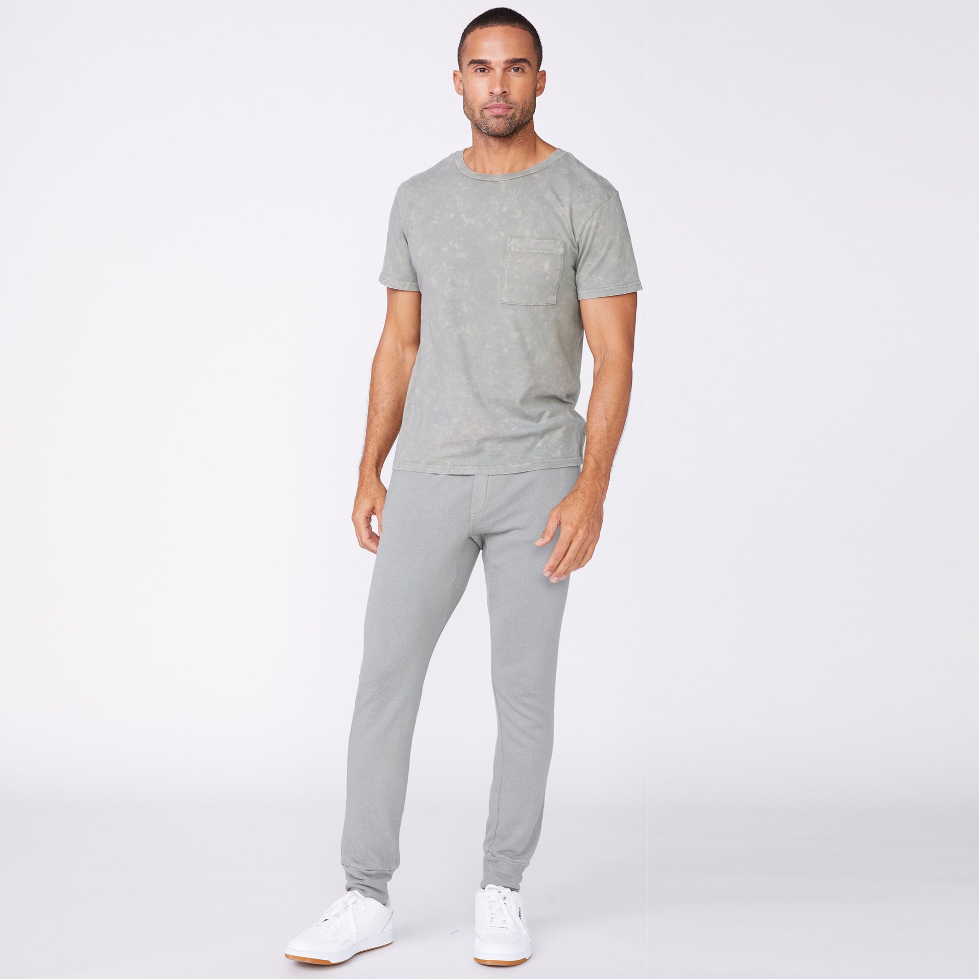 • Anything but boring. Our Stone Wash Relaxed Pocket Crew is made with 100% cotton, a crew neckline, and a classic cut. Pair with our Bungee Chord Sporty Joggers to complete the look.