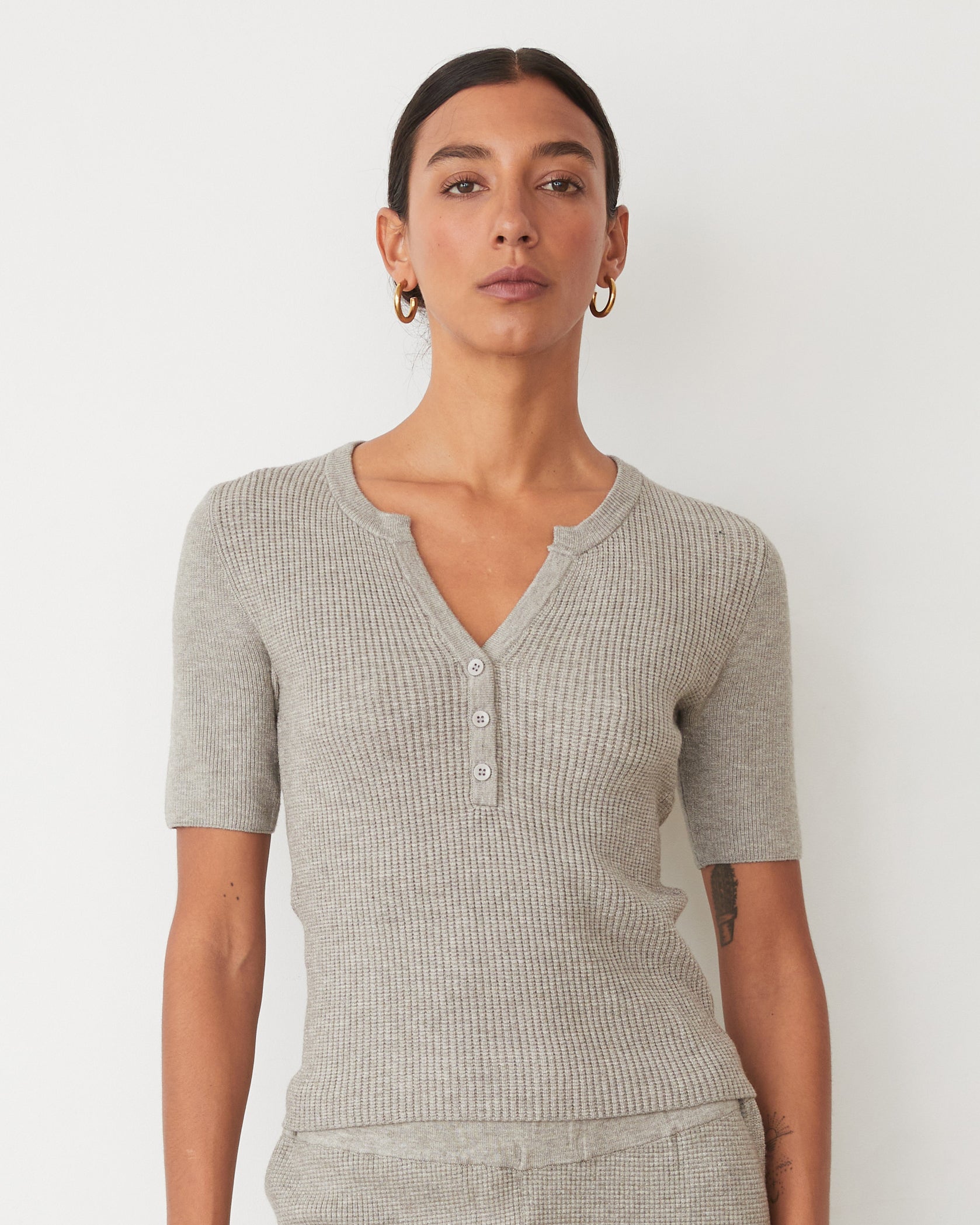 • Delicate henley placket with a notched neckline